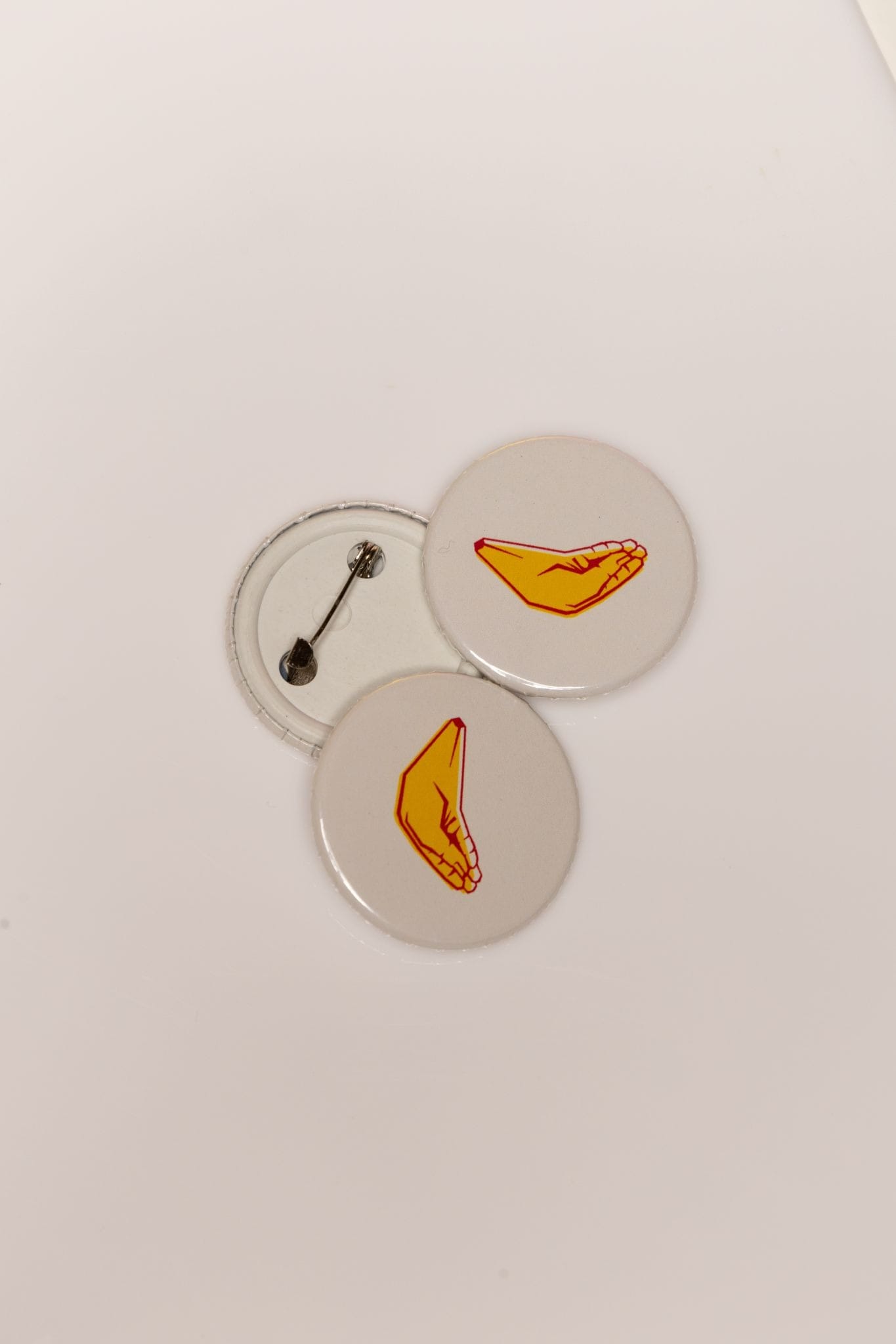 Os bottons de Uma Penca são produzidos em material plástico e contam com uma presilha de alfinete de metal na parte traseira.